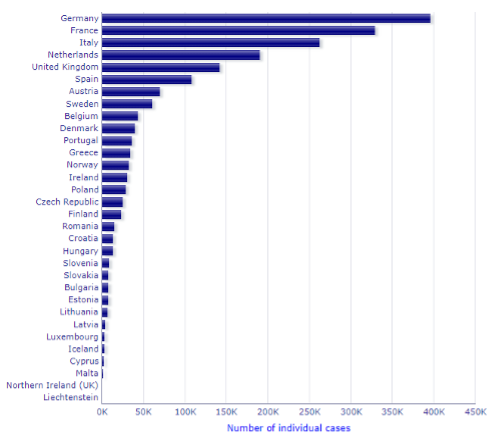 This stands out even more when looking at the number of ICSRs reported to EudraVigilance. There are fewer reports of adverse events coming from France than Germany and only slightly more than from Italy.