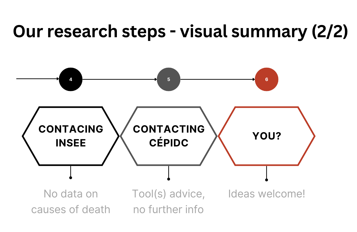 We contacted Insee in January 2022. Insee is the French National Institute of Statistics and Economic Studies. Their website provided the following information: “All events concerning the civil register should be covered by an act drawn up in line with very precise rules, in a special format, by a person invested with the functions of civil registrar. Each municipality has its own registry service. The mayor is the legal civil registrar. The registrar must record all events which occur in his municipality (births, deaths, marriages).” Insee responded very quickly and informed us that they do not produce data on causes of death and only record the total number of deaths reported by the municipalities. They directed us to CépiDc who produces data on medical causes of death in France.