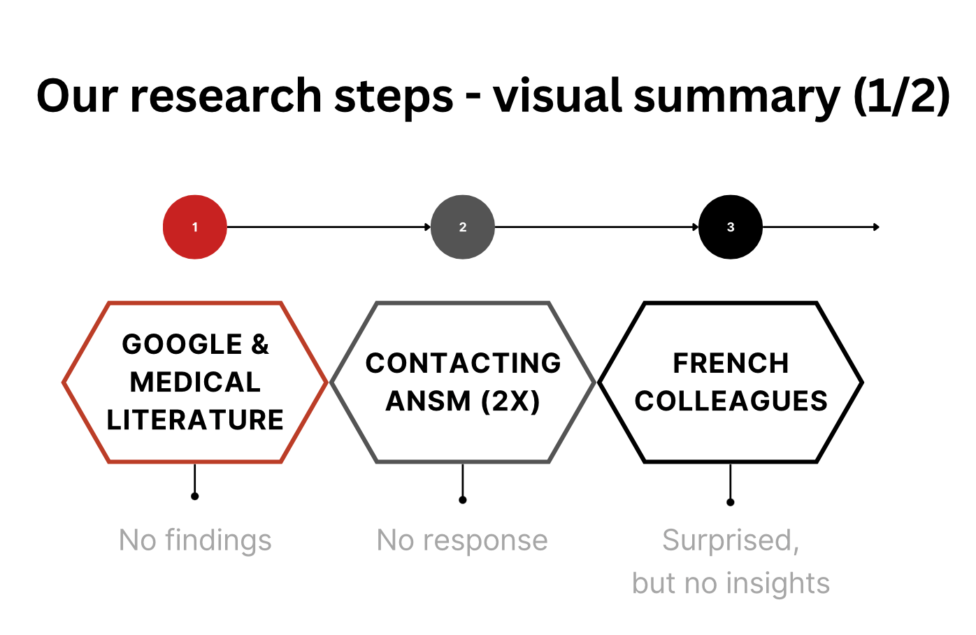 We performed search on Google and medical literature databases for more information but with no luck. We could not find anything related to this. So, we decided to do our own grass-root research and contacted ANSM on 19th October 2021 (and still haven’t heard back from them). While waiting for response from ANSM, we contacted a few French pharmacovigilance colleagues and ANSM again through another email address in December 2021
