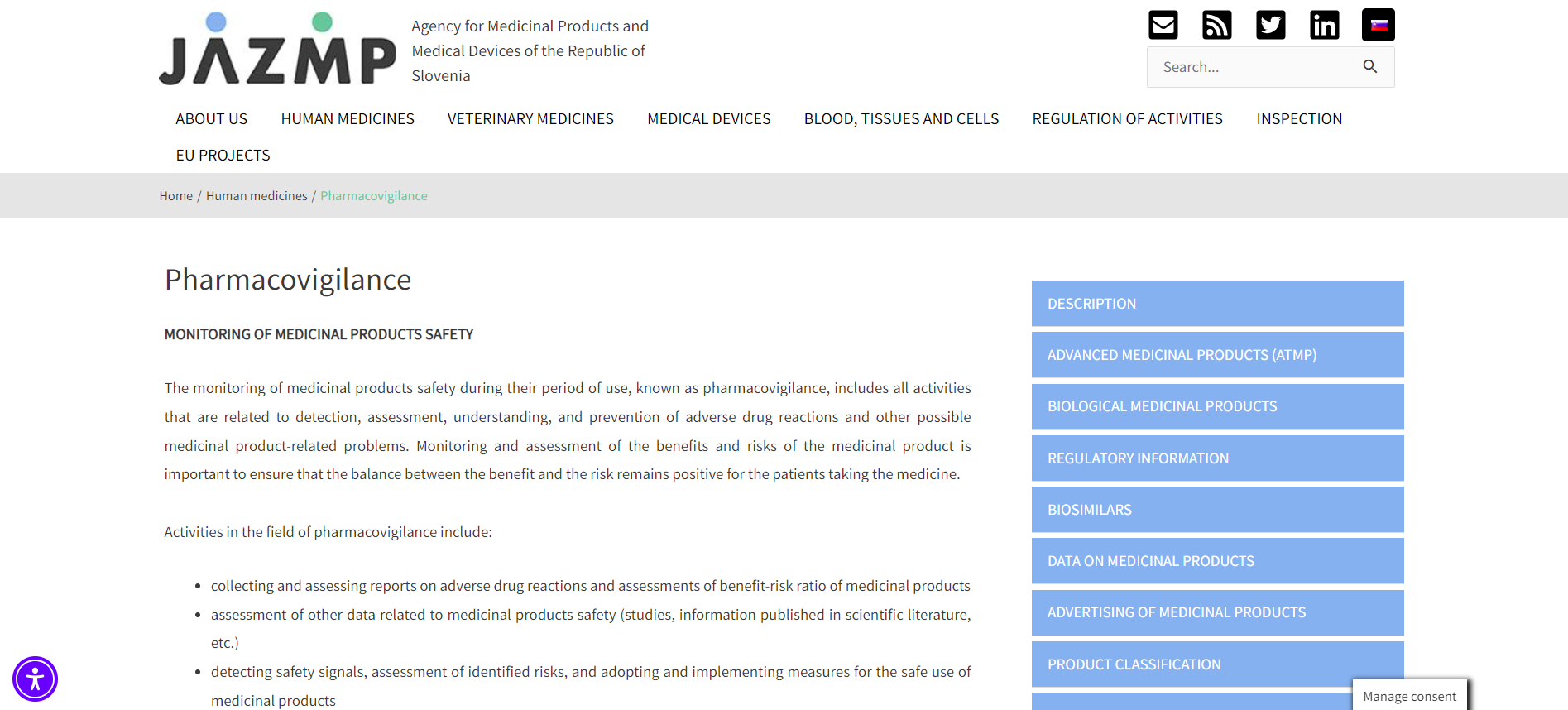 The main authority on pharmacovigilance in Slovenia is the Agency for Medicinal Products and Medical Devices of the Republic of Slovenia (JAZMP), located Ljubljana.