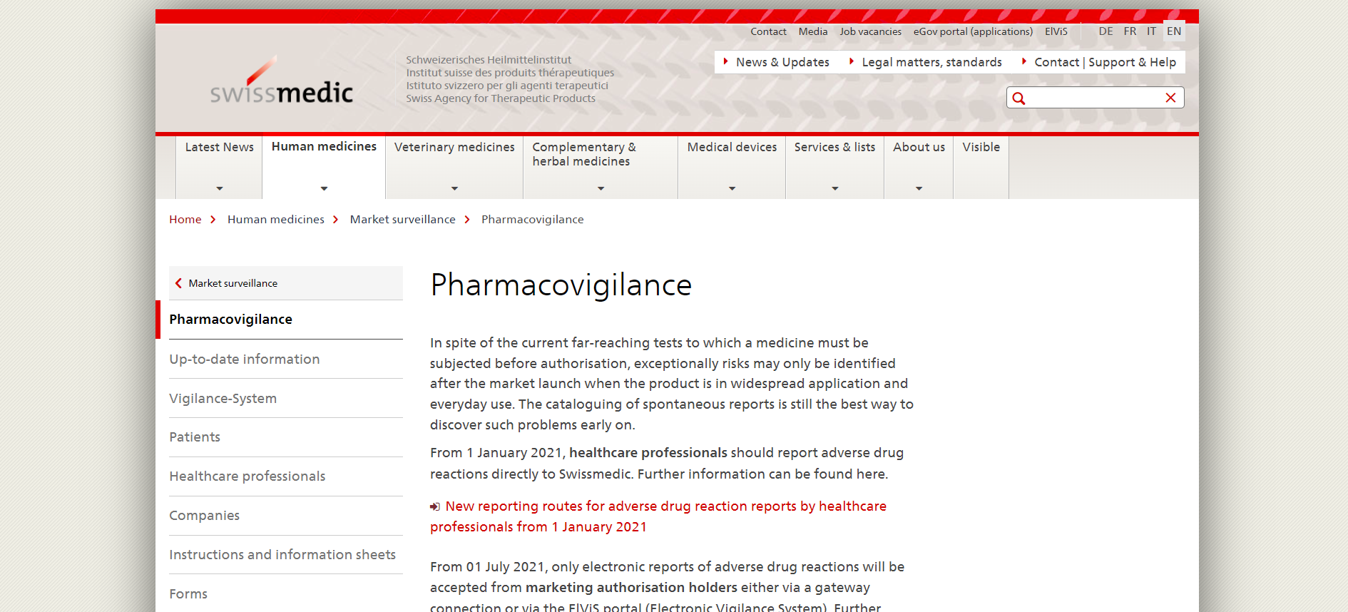 The main authority on pharmacovigilance in Switzerland is Swissmedic, officially known as the Swiss Agency for Therapeutic Products.