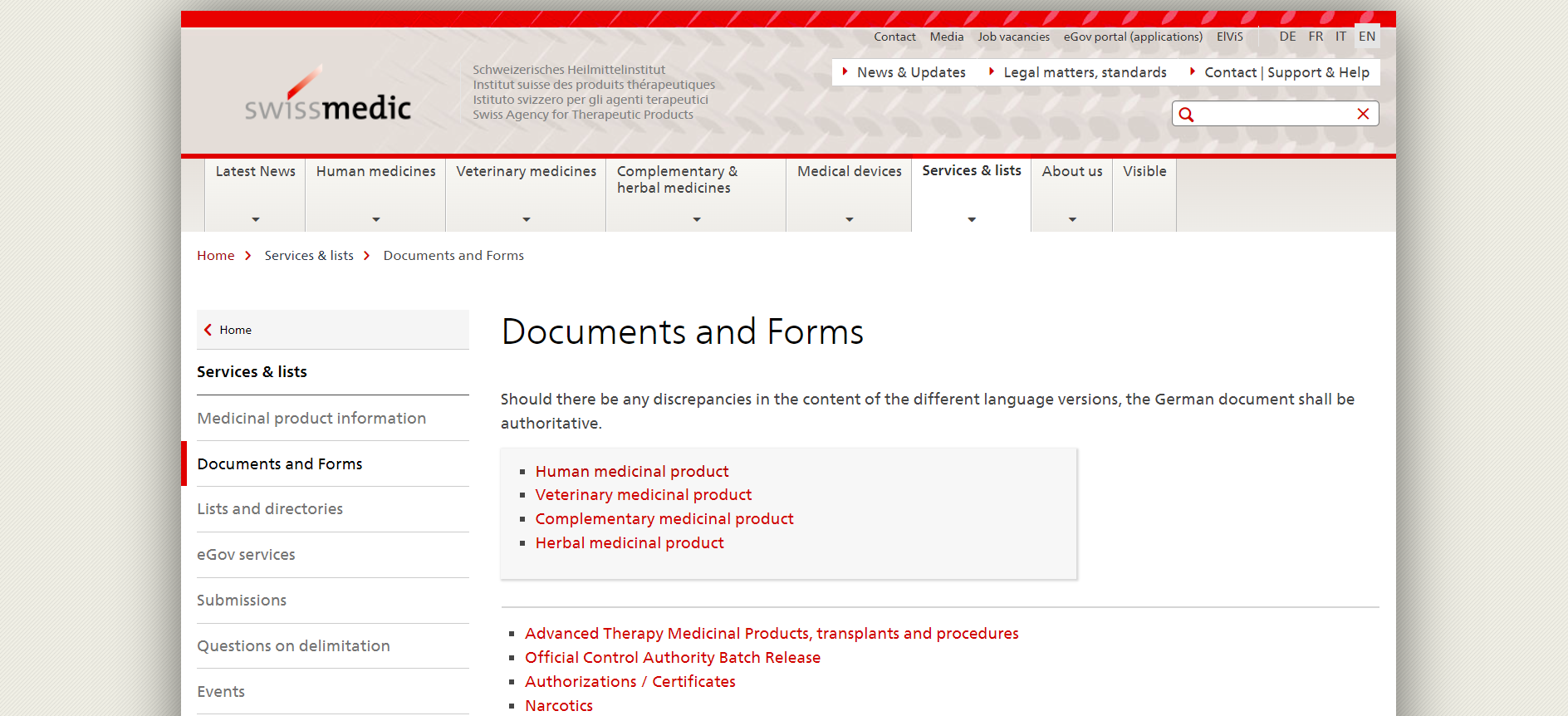 Here you’ll find documents and forms regarding many areas, including Human medicinal product. Under Market surveillance there’s also pharmacovigilance section with form for reportind ADR and others.