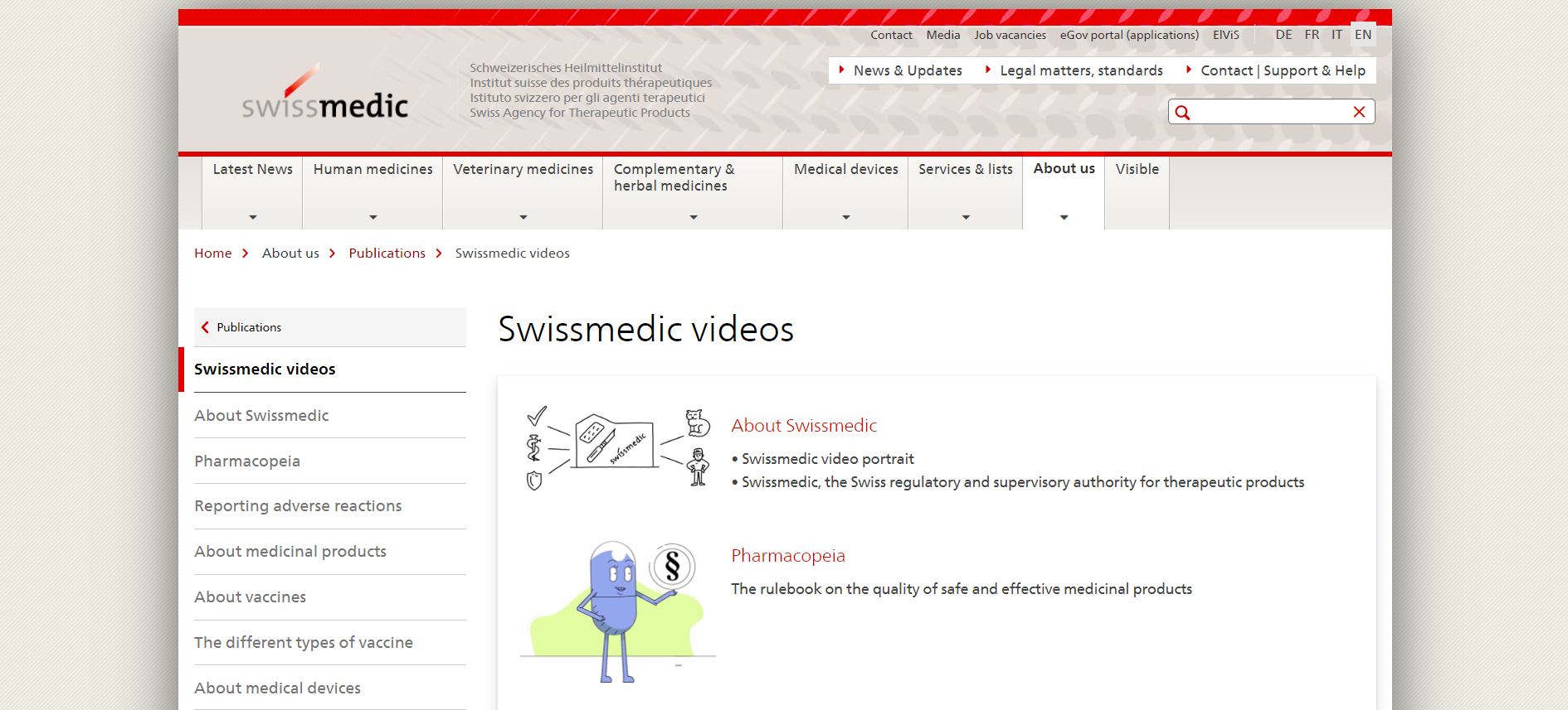 Short videos, created directly by Swissmedic, regarding many areas like Pharmacopeia, Reporting adverse reactions, Medicinal products or Swissmedic itself.